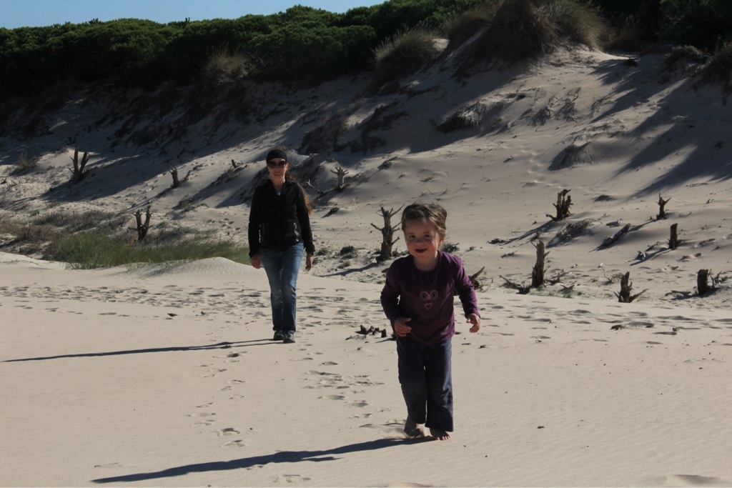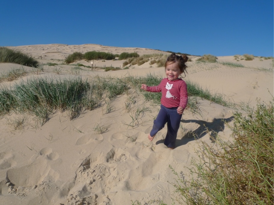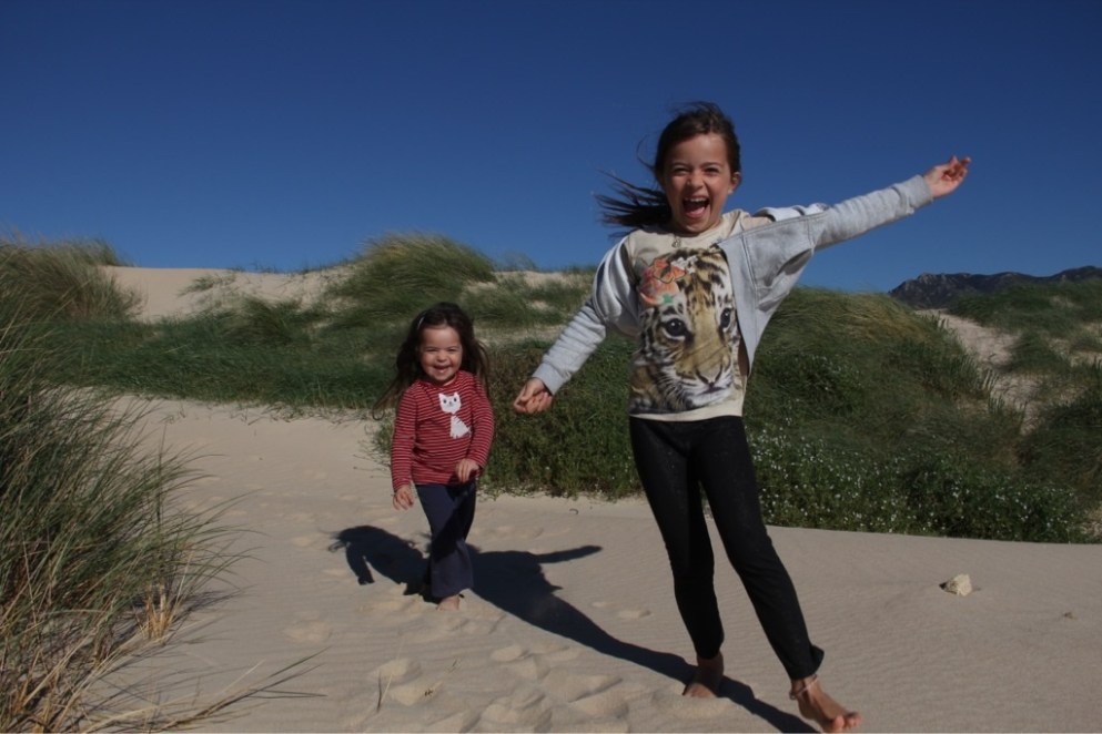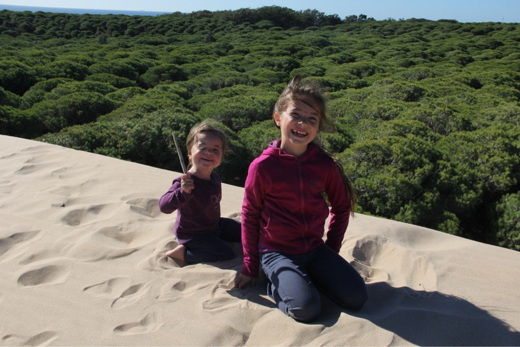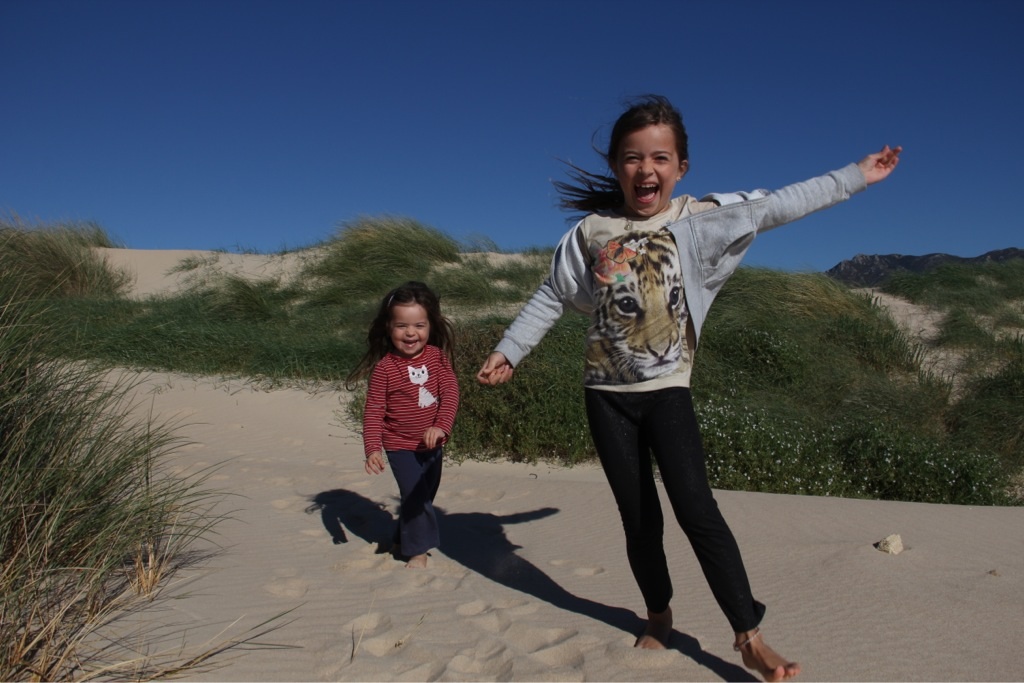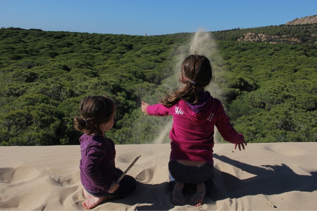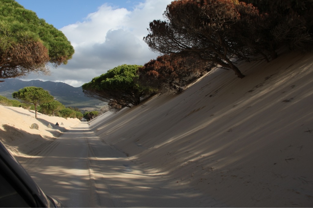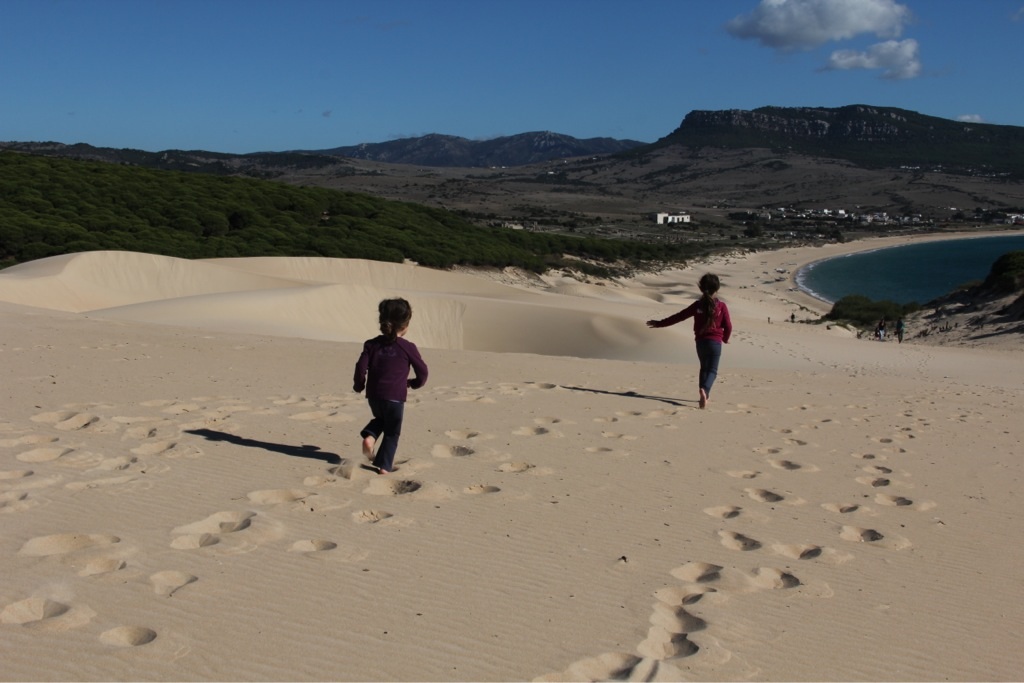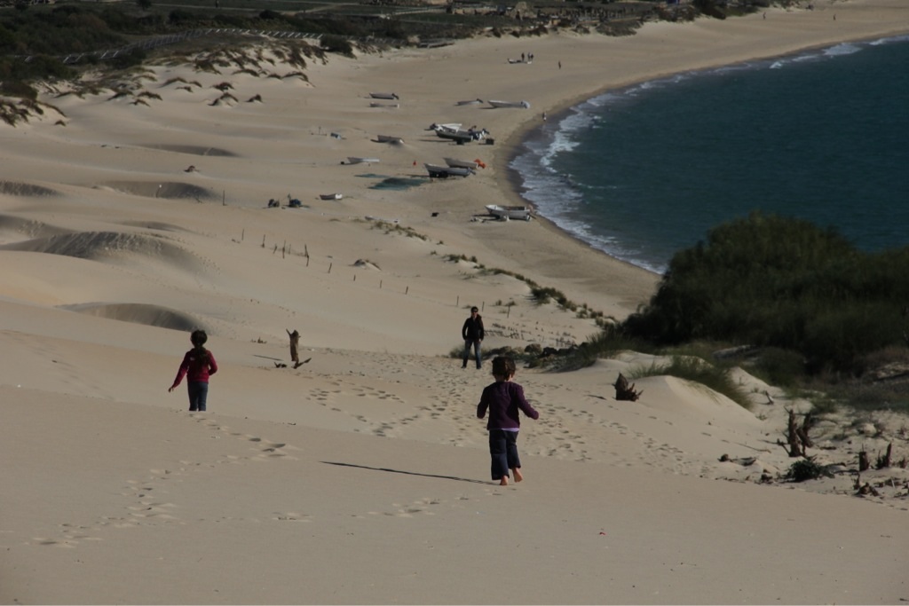 Hier, am Übergang vom Mittelmeer zum Atlantik herrscht an über 300 Tagen im Jahr Starkwind – ein Paradies für Windsurfer und Kitesurfer – manche nennen Tarifa auch eine der Welthauptstädte des Windsurfens. Naturgemäß hat es jetzt im Winter noch stärkeren Wind als im Sommer, daher sind jetzt auch nur wahre Könner im Einsatz – zu diesen gehört Esteban leider noch nicht, denn es ist ein gewaltiger Unterschied zwischen dem September – Wind auf Sardinien, wo Esteban das Windsurfen „gelernt“ hat und dem Dezember- Wind in Tarifa, dazu noch die starke Strömung im Atlantik, da lassen wir ‚mal lieber die Spezialisten ans Werk. Aber auch schon das Zuschauen ist ein Erlebnis, sofern es einem nicht die Sandkörner ins Gesicht schleudert… Der starke Wind hat zudem am Westende der Bucht eine riesige Sanddüne entstehen lassen, die langsam den Pinienwald unter sich begräbt und die sich hervorragend zum Klettern und Toben eignet, insbesondere Esmeralda und Penelope waren davon begeistert.