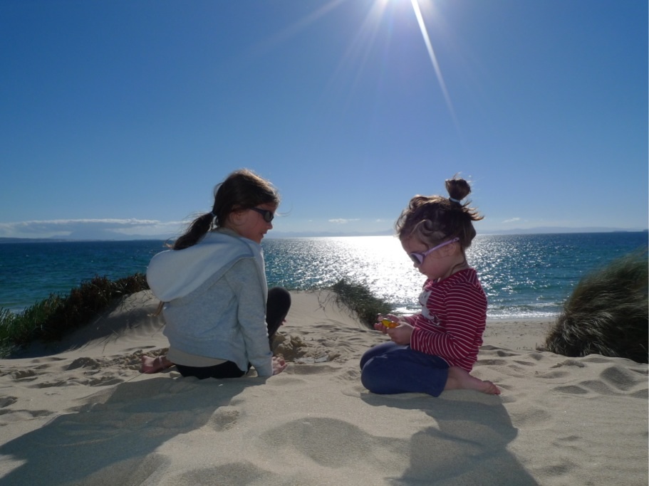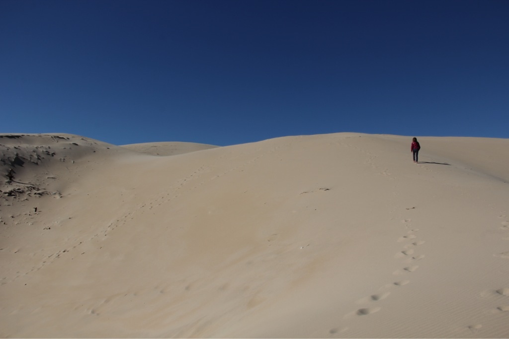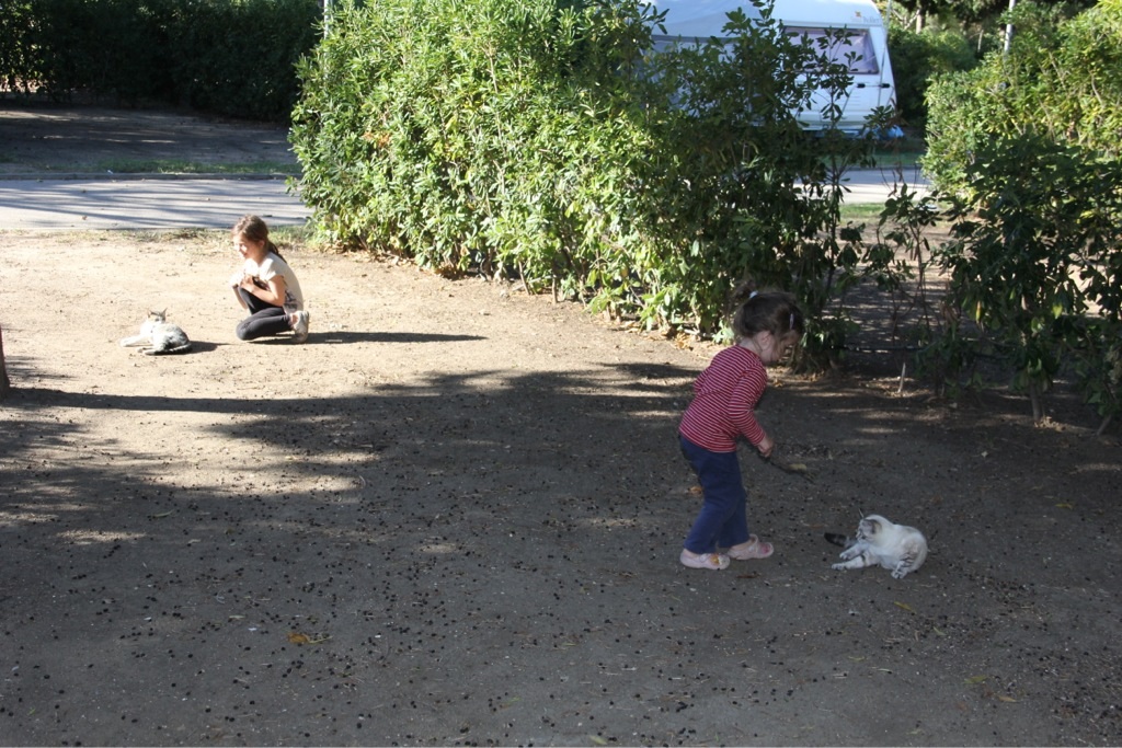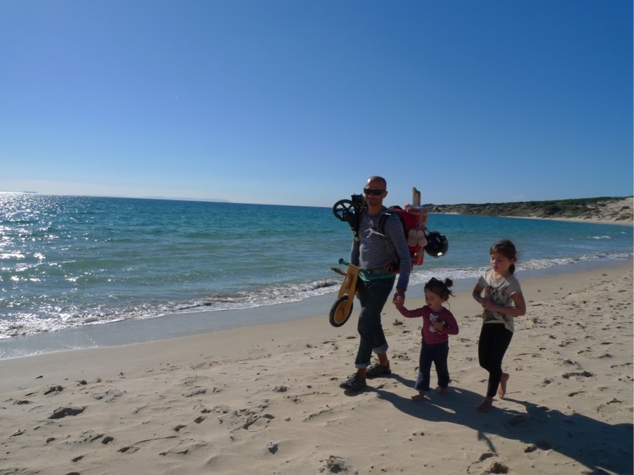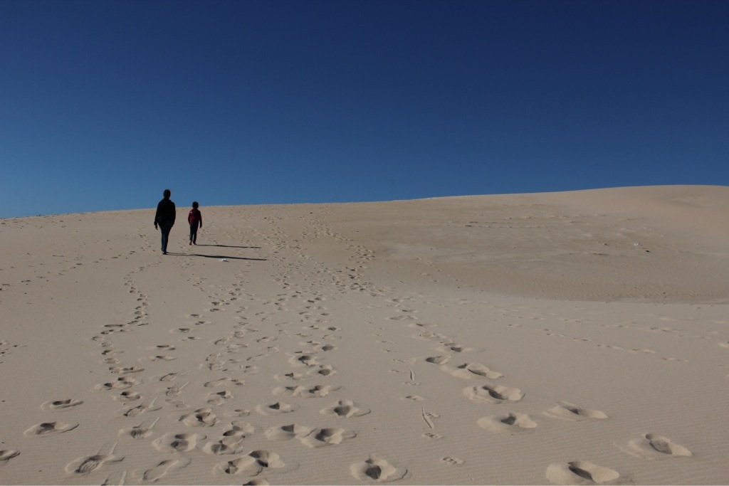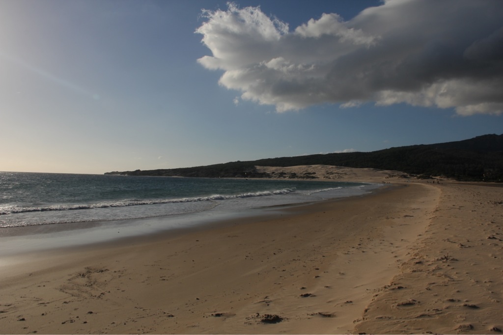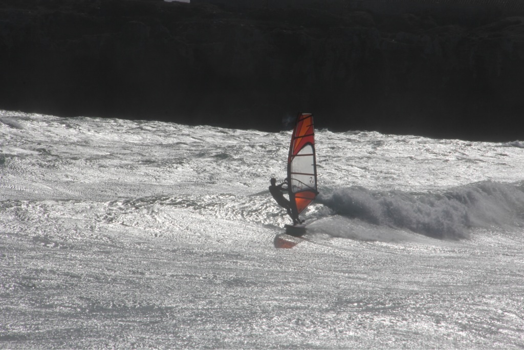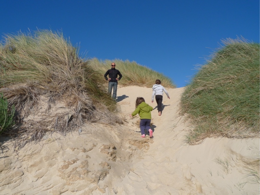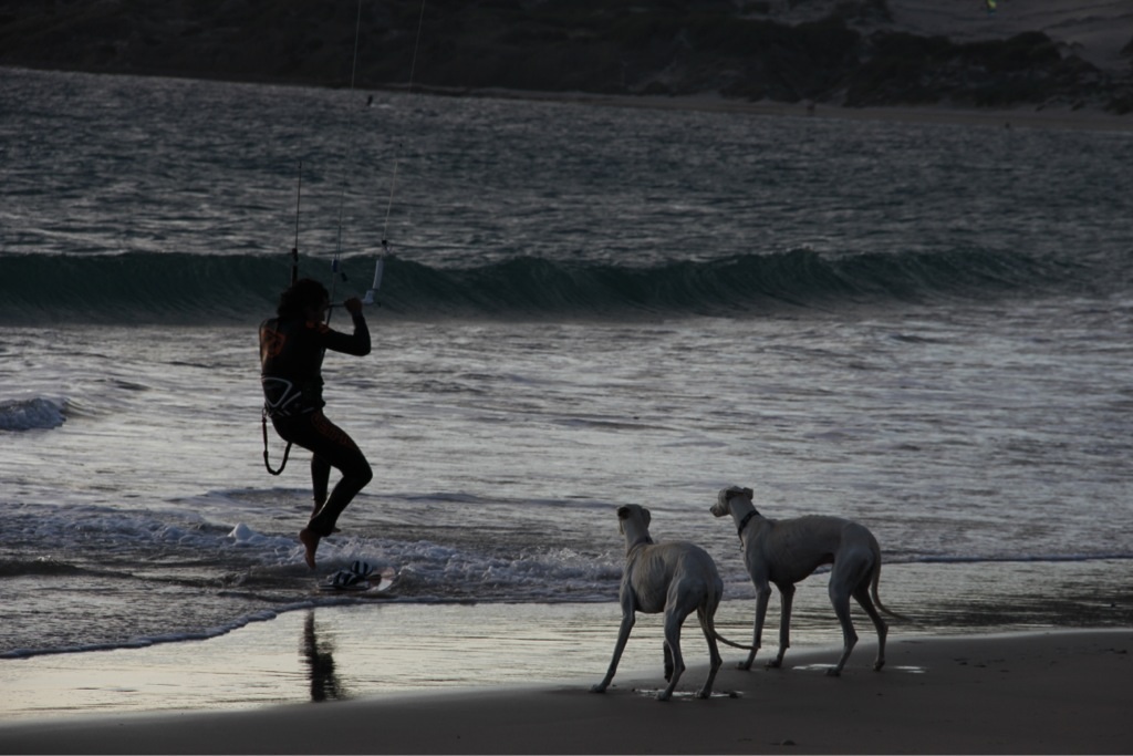 Hier, am Übergang vom Mittelmeer zum Atlantik herrscht an über 300 Tagen im Jahr Starkwind – ein Paradies für Windsurfer und Kitesurfer – manche nennen Tarifa auch eine der Welthauptstädte des Windsurfens. Naturgemäß hat es jetzt im Winter noch stärkeren Wind als im Sommer, daher sind jetzt auch nur wahre Könner im Einsatz – zu diesen gehört Esteban leider noch nicht, denn es ist ein gewaltiger Unterschied zwischen dem September – Wind auf Sardinien, wo Esteban das Windsurfen „gelernt“ hat und dem Dezember- Wind in Tarifa, dazu noch die starke Strömung im Atlantik, da lassen wir ‚mal lieber die Spezialisten ans Werk. Aber auch schon das Zuschauen ist ein Erlebnis, sofern es einem nicht die Sandkörner ins Gesicht schleudert… Der starke Wind hat zudem am Westende der Bucht eine riesige Sanddüne entstehen lassen, die langsam den Pinienwald unter sich begräbt und die sich hervorragend zum Klettern und Toben eignet, insbesondere Esmeralda und Penelope waren davon begeistert.