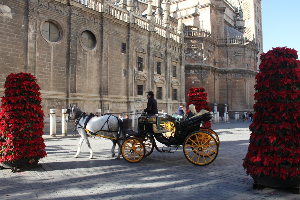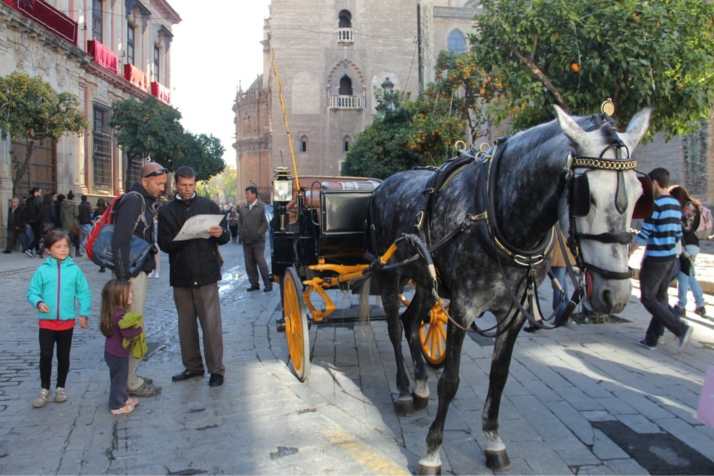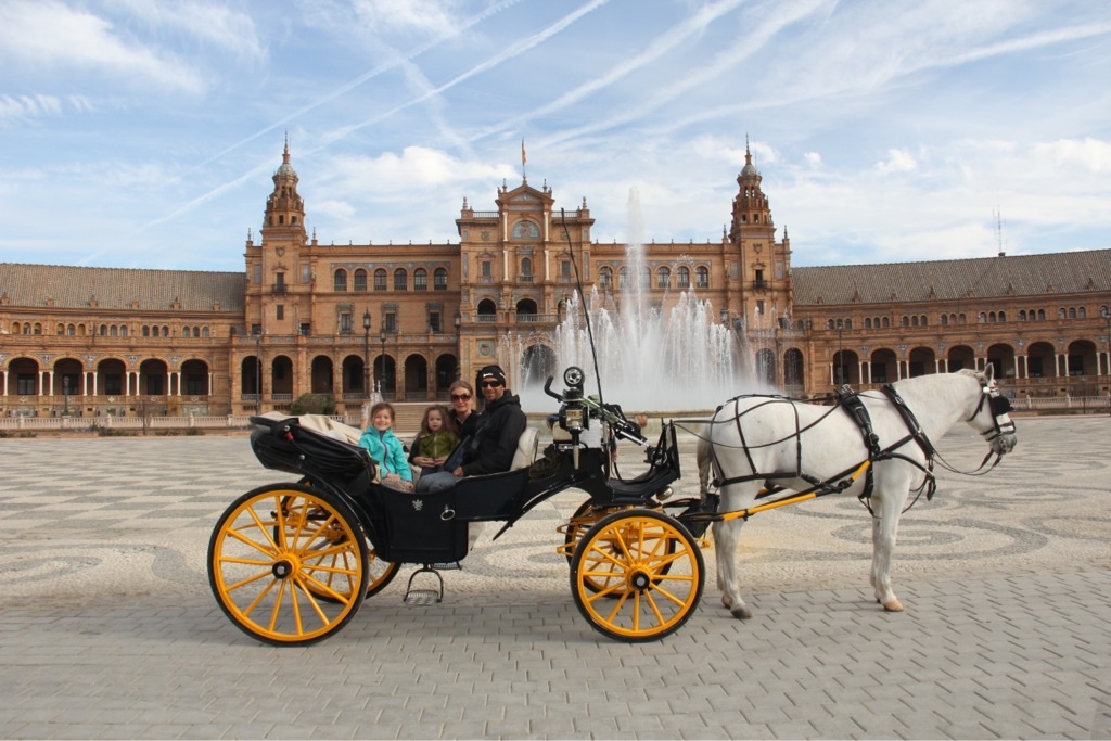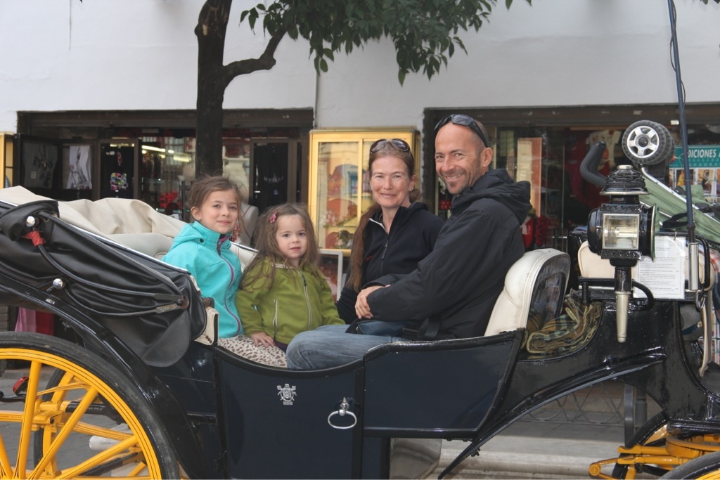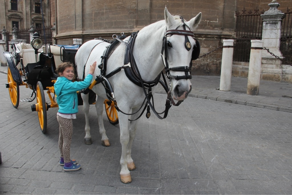 Die Kids wollten unbedingt eine Kutschenfahrt durch die Stadt machen und nach 3 Tagen Bearbeitung – fest unterstützt von Mama – hatten die Damen auch Papa Esteban überzeugt, dass dies wirklich das Beste ist, was man in Sevilla machen kann. Esteban wollte das Geld übrigens lieber in einer Tapas-Bar liegen lassen, doch 3:1 – da war nichts zu machen. Wir fuhren also mit einer schwarzen Kutsche, gezogen von einem Schimmel namens Blanco durch die Innenstadt und die Parks von Sevilla und fühlten uns ein bischen wie Adelige im 18. Jahrhundert.