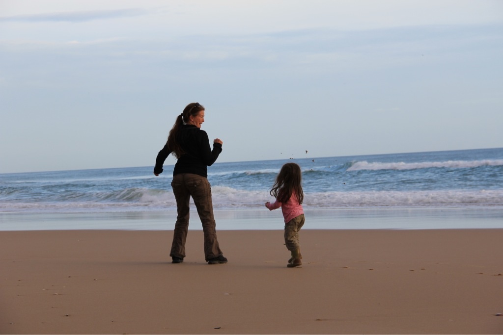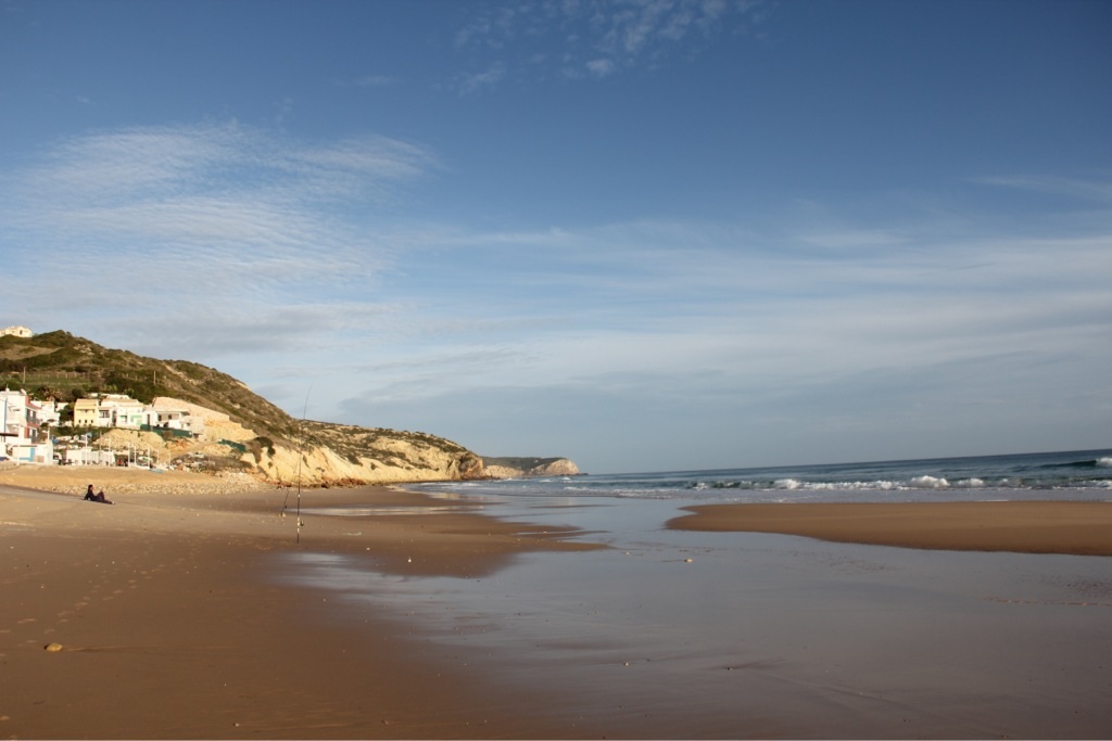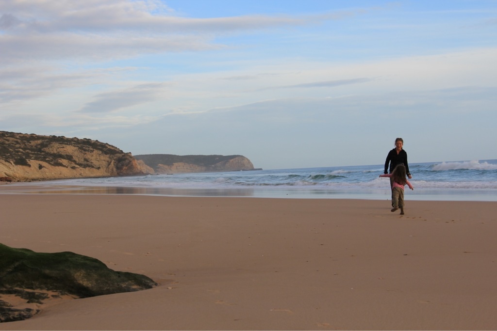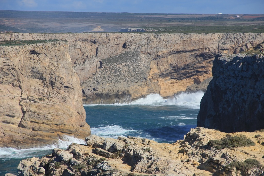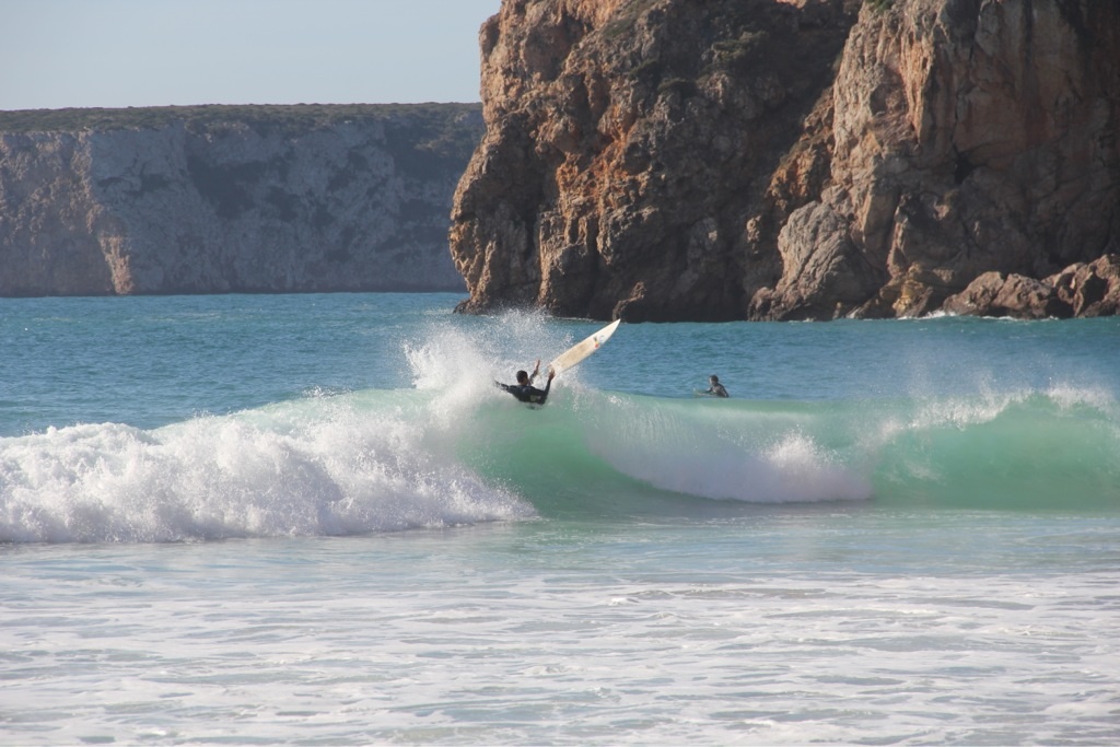 Von hier aus besuchten wir das Cabo de Sao Vicente, den südwestlichsten Punkt Europas. Die Brandung des Atlantiks, welcher hier von Amerika kommend zum ersten Mal auf Land trifft ist wirklich gewaltig. Zunächst ist es ein paar Minuten völlig ruhig, dann kommen drei oder vier riesige Wellen. Auf diese Wellen warten die zahlreichen Surfer an den diversen Surfspots der Gegend, für Strandspaziergänger kann das aber richtig gefährlich werden, wie das Drama mit den portugiesischen Studenten, welche von so einer Monsterwelle ins Meer gespült wurden und ertranken, zeigt. Familie Ausgeflogen beobachtete daher die Kraft der Natur und das Können der Surfer aus sicherer Entfernung.